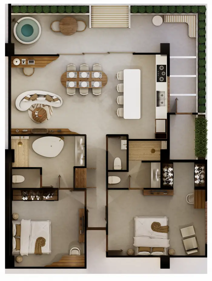 Step into the ultimate in luxury living with the 110 sqm Two-Bedroom Grand Terrace Suite, where sophistication meets serenity. This spacious suite features an open and airy layout with a charming kitchen, a beautifully designed living area, and two comfortable bedrooms. But what truly sets this suite apart is the private outdoor tub located on the generous balcony, offering breathtaking ocean views that elevate your living experience to new heights.