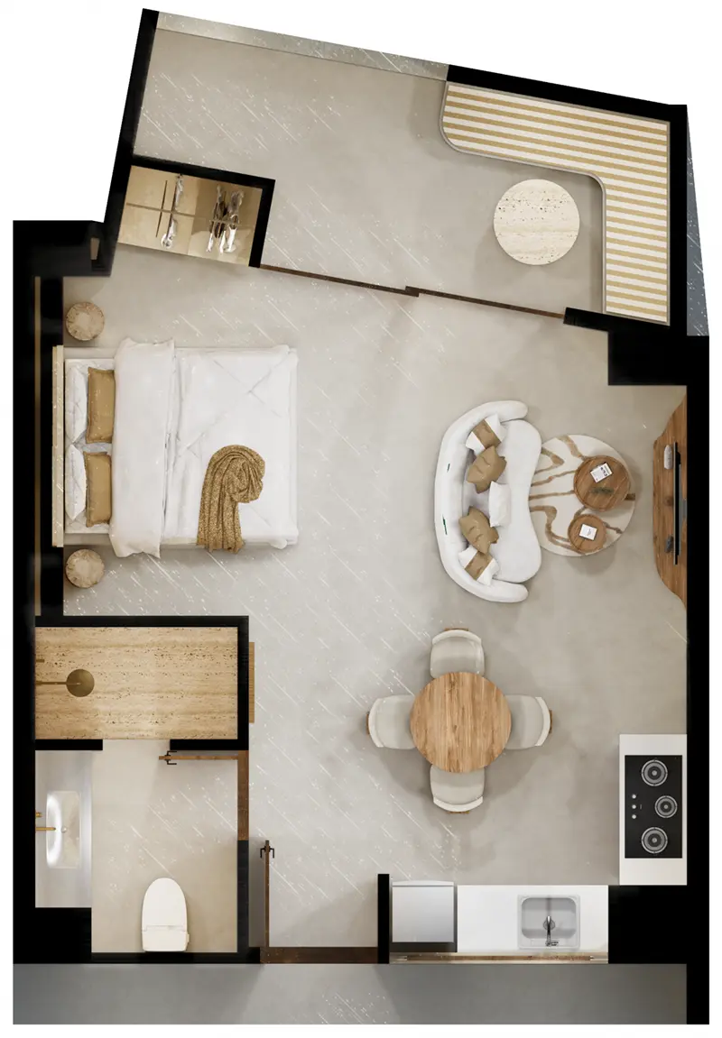 Nestled in the heart of nature, this 47 sqm mountain view studio offers a peaceful sanctuary where the beauty of Lombok’s mountains meets modern living. The spacious open layout features a comfortable living room and a fully equipped contemporary kitchen, designed to maximize both comfort and functionality. Expansive floor-to-ceiling windows frame stunning mountain vistas, bringing the splendor of nature right into your living space.