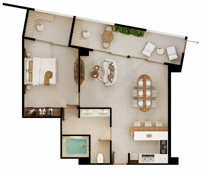 Discover the perfect blend of serenity and sophistication in this 60 sqm mountain-view studio. Thoughtfully designed for maximum comfort and natural beauty, this apartment features an open-plan layout with a spacious living room and a contemporary kitchen. Expansive floor-to-ceiling windows offer breathtaking views of the mountains, allowing you to immerse yourself in the natural splendor of Lombok right from the comfort of your own home.