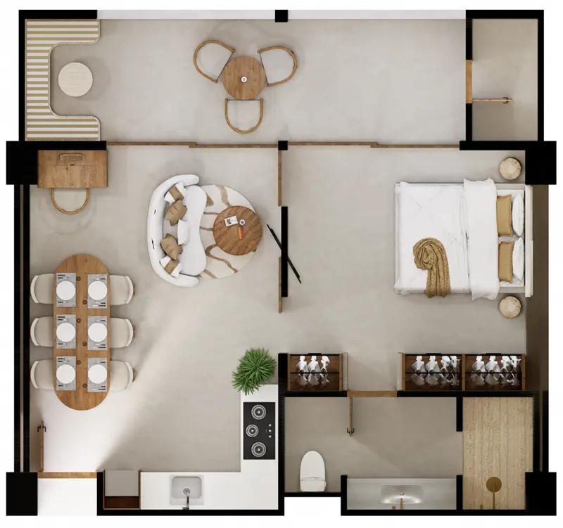 The One-Bedroom Pool View Suite is a perfect choice for investors looking for both luxury living and high returns, or for those seeking a tranquil escape in the heart of Lombok’s thriving Kuta area.